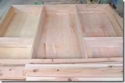 一度加工したオーダーメイド壁面収納を仮組み立てしているところです。この時、きちんとした長方形になっているか、うまく組立できるかなどチェックします。問題が無い事をチェックした後にお客様の所へ運んで組み立てるのです。