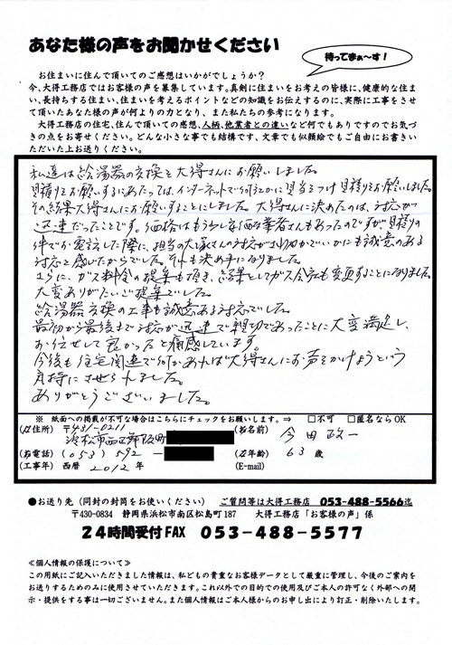 最初から最後まで対応が迅速で親切であったことに大変満足し、お任せして良かったと痛感しています。今後も住宅関連で何かあれば大得さんにお声をかけようという気持ちにさせられました。