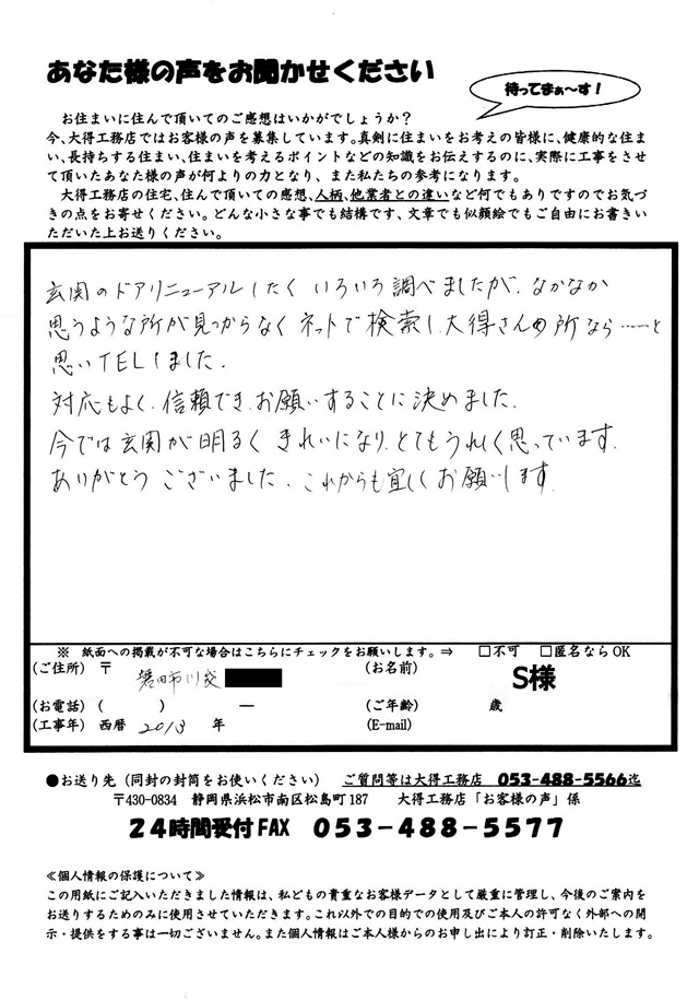 081 玄関のドアリニューアルしたくいろいろ調べましたが、なかなか思うような所が見つからなくネットで検索し、大得さんの所なら……と思い、TELしました。