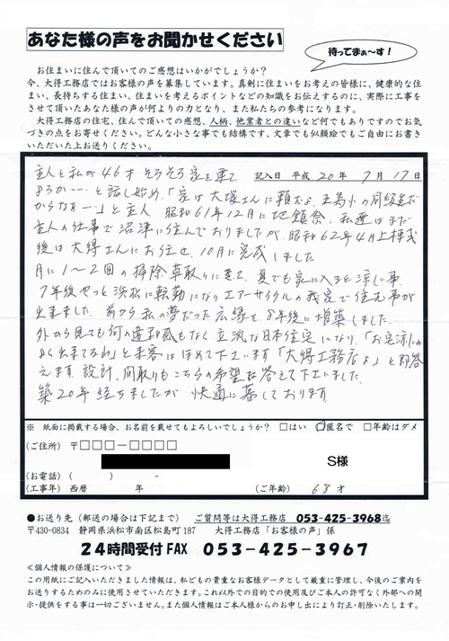昭和61年に地鎮祭、私たちはまだ主人の仕事で沼津に住んでおりましたが、昭和62年4月上棟式後は大得さんにお任せ。11月に完成しました。