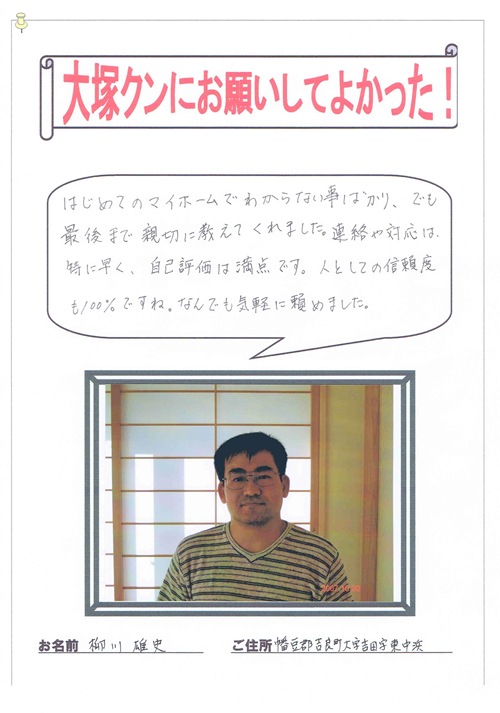 お客様の声連絡や対応は特に早く、自己評価は満点です2011.06.05 初めてのマイホームでわからない事ばかり。でも最後まで親切に教えてくれました。 連絡や対応は特に早く、自己評価は満点です。 人としての信頼度も100%ですね。何でも気軽に頼めました。 幡豆郡吉良町 柳川様 私、大塚美秀は以前愛知県の住宅会社に勤めていたのですが、そちらで担当させて頂いたお客様が書いて下さった嬉しいお手紙のご紹介です。 愛知県での勤務だったため、お客様のお住まいも愛知県になります この記事は役に立ちましたか?もし参考になりましたら、下記のボタンで教えてください。 大塚 美秀 投稿ナビゲーション
