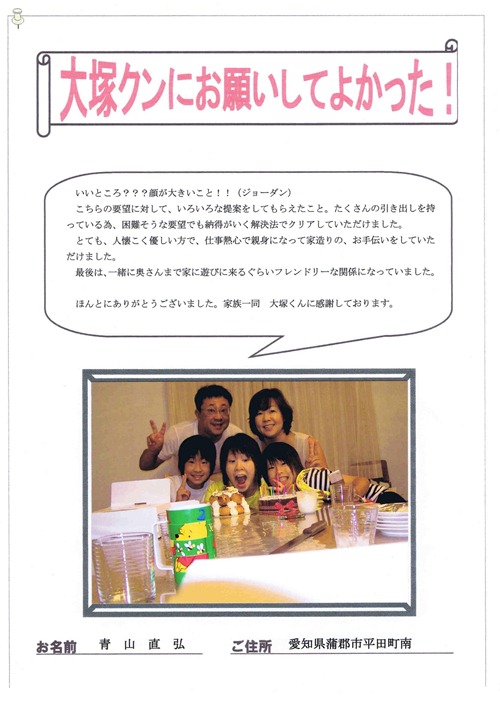 私、大塚美秀は以前愛知県の住宅会社に勤めていたのですが、そちらで担当させて頂いたお客様が書いて下さった嬉しいお手紙のご紹介です。