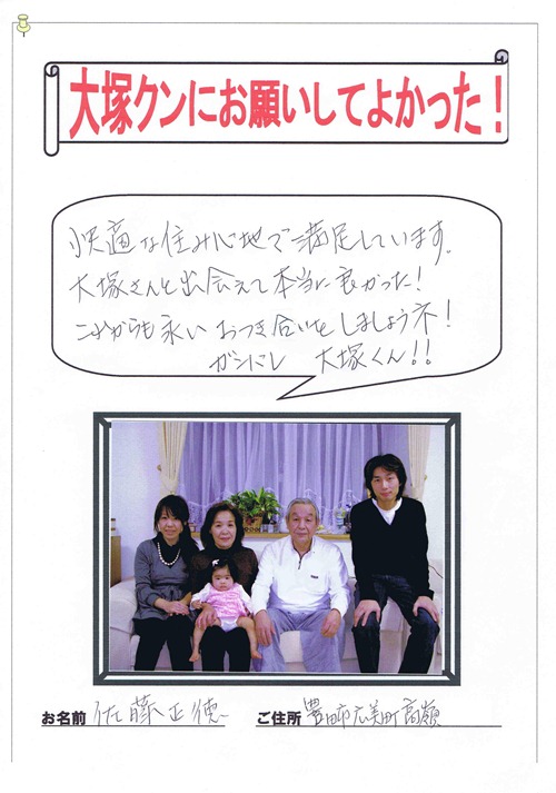 お客様の声大塚さんと出会えて本当に良かった!2011.11.042012.04.20 快適な住み心地で満足しています。 大塚さんと出会えて本当に良かった!これからも永いおつき合いをしましょうネ! ガンバレ 大塚くん!! 私、大塚美秀は以前愛知県の住宅会社に勤めていたのですが、そちらで担当させて頂いたお客様が書いて下さった嬉しいお手紙のご紹介です。 愛知県での勤務だったため、お客様のお住まいも愛知県になります この記事は役に立ちましたか?もし参考になりましたら、下記のボタンで教えてください。 大塚 美秀 投稿ナビゲーション