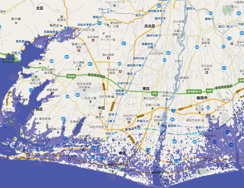 青いエリアが陸地に入り込んできました。そこが比較的土地の高さが低い部分です。浜名湖や佐鳴湖の近辺は少し進みが早いようです。