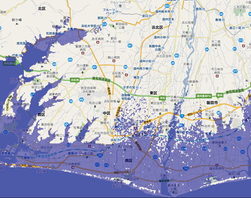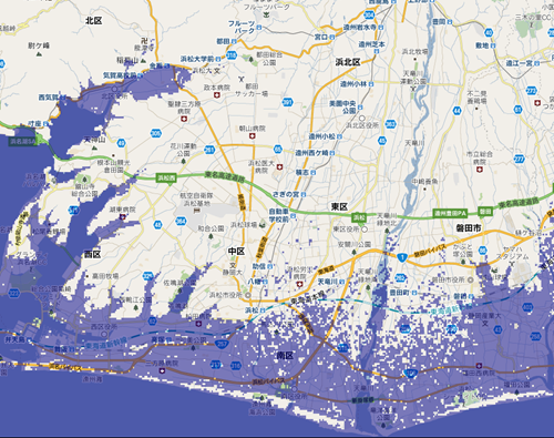 浜松市の西区と南区に大分水が来ています。水が届くエリアがまばらになっているのは土地の高さが微妙に違うからかもしれません。