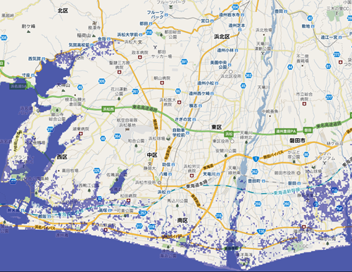 浜松と磐田の地震と津波への対策に、洪水マップ