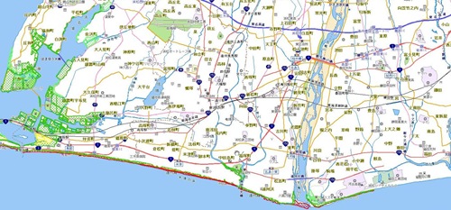 ちょっと分かりにくいですが、地図上に赤・緑でアミかけされている部分が推定津波浸水区域です。海岸線沿いの赤いアミかけ部分が浸水深さ2メートル以上の区域、緑のアミかけ部分が浸水深さ50cm以下の区域です。