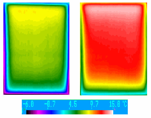 左はLow-Eガラスを使った時のガラス表面温度、右はLow-Eガラスを使わない時のガラス表面温度です。このテストでは表面温度が10度くらい違っています。