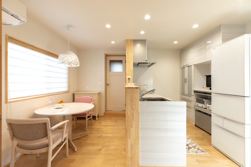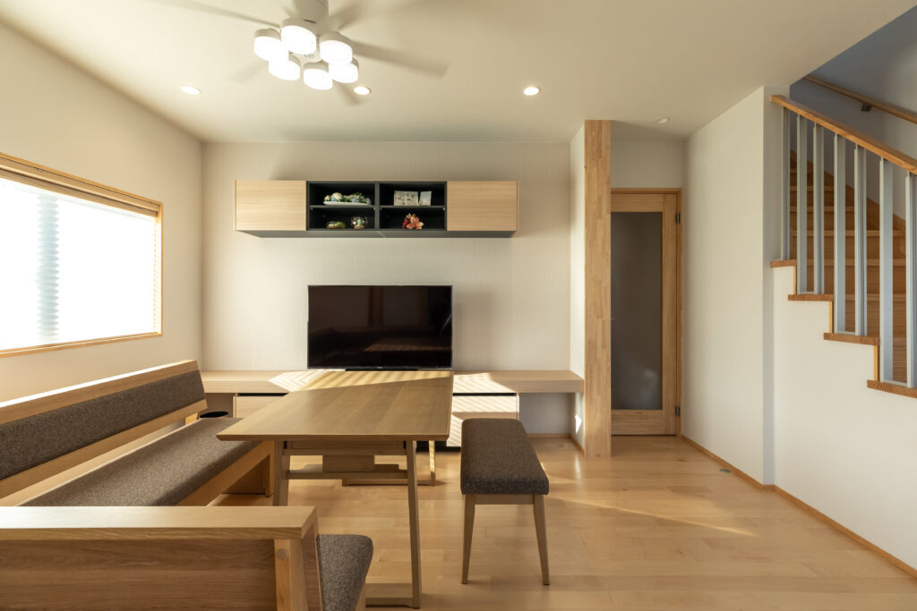内部はN様のご希望で明るくナチュラルなイメージでまとめさせて頂き、白を基調としたシンプルなコーディネートをさせて頂きました。N様が選ばれた床材は西洋桜とも言われる木目のおとなしいバーチ材。淡くやさしい木目で丈夫さと美しさを備えた床材です。