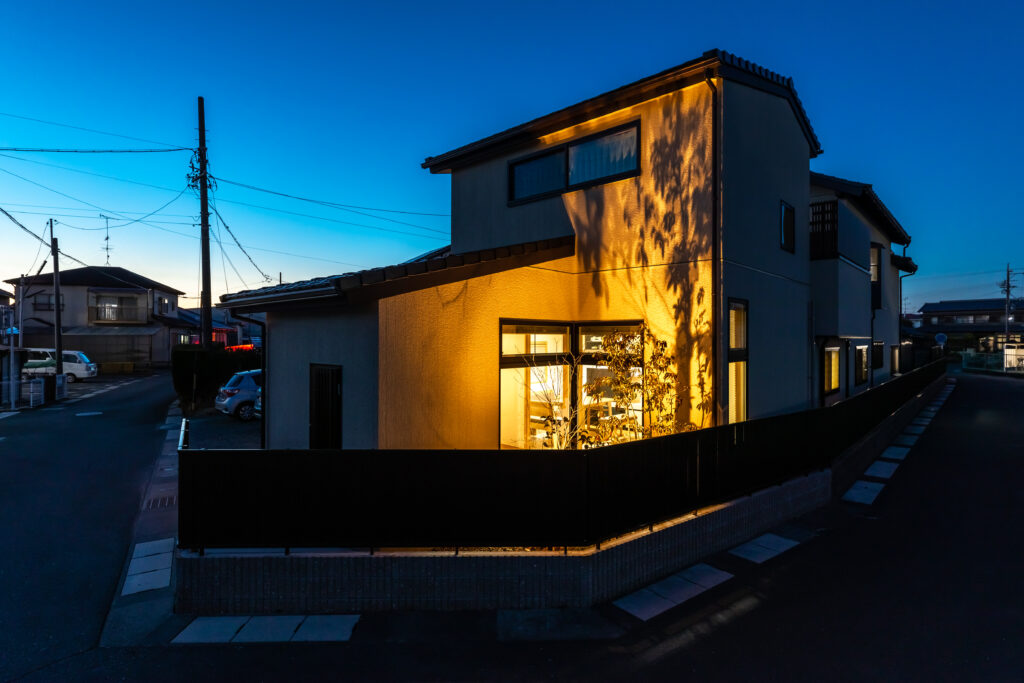 ライトアップは夜暗くなると自動で点灯してタイマーで消灯します。エクステリアライトは消し忘れやすいのでタイマー式は便利です。植栽や外壁を照らして間接的なライトアップにすると家の印象がグッと良くなります。