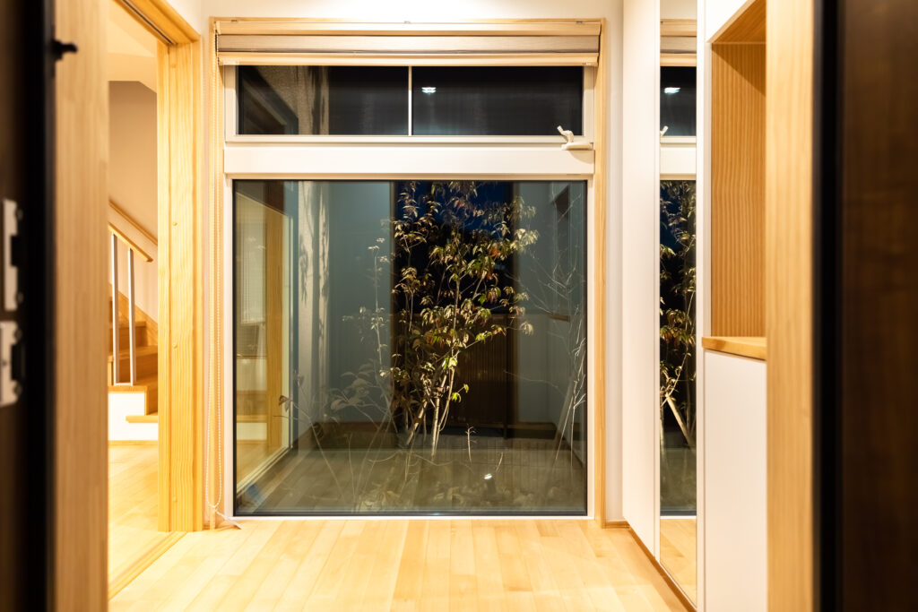 N様邸は来客が多いため、来客用の玄関と応接間を設け、玄関と応接間から庭を眺められるよう計画させて頂きました。