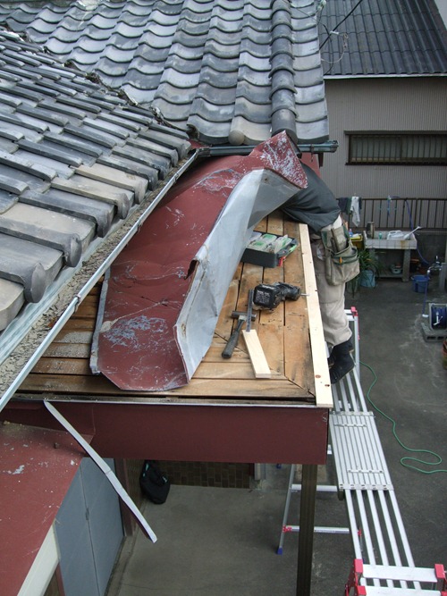 保険申請後、すぐに工事に取り掛かります。めくれた屋根の防水下地を新しくして、板金屋根の新設工事です。折れてしまった屋根はもう使えないので、新しい板金屋根を葺き直して工事を完了します。