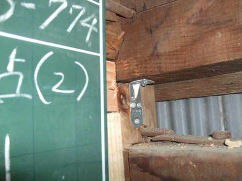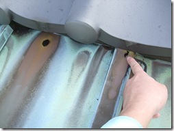 玄関屋根の上です。一時しのぎにお客様がビニールシートをかぶせた状態でした。ビニールシートをめくってみると、板金屋根がボコボコです・・・![]()