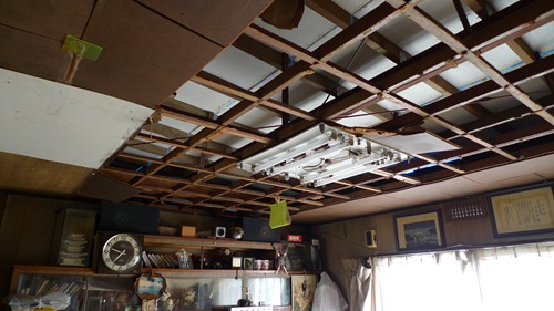 他の部屋も天井は雨シミだらけです。まあ、あれだけ屋根が飛んでいってしまえば仕方ないですね・・・![]()