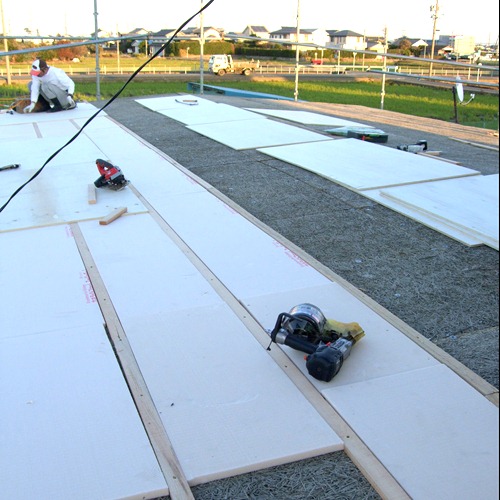 この断熱材はカネライトフォームと言って、少しの厚みでも高い断熱性能を持っています。そのため、厚み自体はそれほど無くとも効果は十分感じられます。このような断熱補強工事は住み心地が大きく変わりますし、屋根の葺き替え工事などをする場合は非常に作業をしやすいのでかなりオススメです。