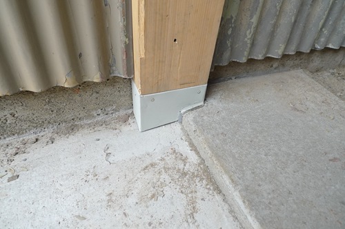 工事前の建具です。木の枠組みにトタンを張っただけの建具で扉自体がかなり反ってきていました。右は扉の丁番を取り付けていた柱です。柱からビスが抜けてしまっており、ボロボロになっています。