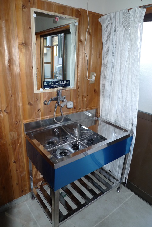交換した新しい作業台です。ステンレス製でシンクも深く広くなりました。