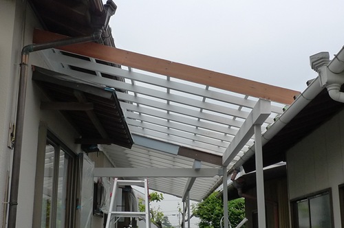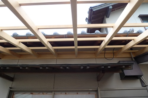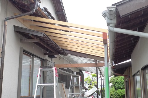サッシメーカーなどでアルミ製のテラス屋根がありますが、一体感を出すために元々あったテラスと同じ木で屋根を造り、一体感を出しています。