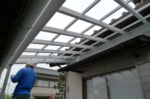 塗装が終わったら、組み上げた屋根にポリカーボネートの屋根を張り、雨に濡れやすい写真手前の木の部分を金属で巻いていきます。