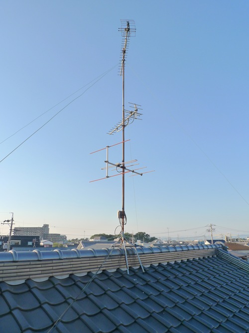 このアンテナは屋根の一番高いところに足を乗せて踏ん張るように設置されています。上に長いアンテナで、魚のホネのような形をしたアンテナの受信部が3つ付いています。