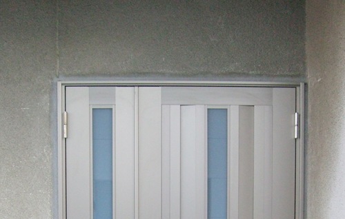 ドアを取り付けたらドア回りが外壁ときれいになじむように補修作業をします。外壁と同じモルタルで丁寧に塗っています。この作業は仕上がりをよくするためにとっても大事なんですよ幽霊