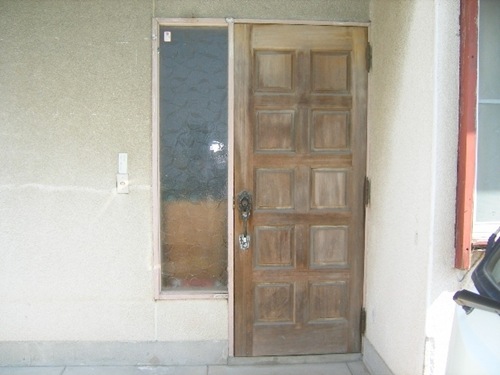 以前多かった木製の玄関ドアです。無垢の木で製作された玄関ドアは、質感が非常に高く、いい素材ではあるのですが