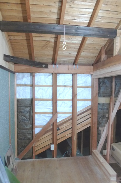 小屋の後ろです。元々の雨樋は取ってしまったので、お隣に雨を流さないように新しい雨樋を付けなければなりません。今回はお客様が自分で付けようと思って以前購入された雨樋を一部使用して工事しました。