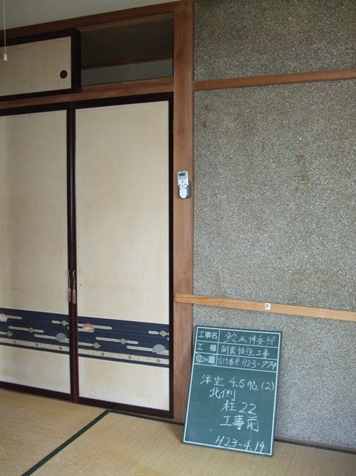 工事前の部屋の様子です。部屋の壁だけでなく、比較的解体と復旧のしやすい押入の中も利用して補強工事をします。