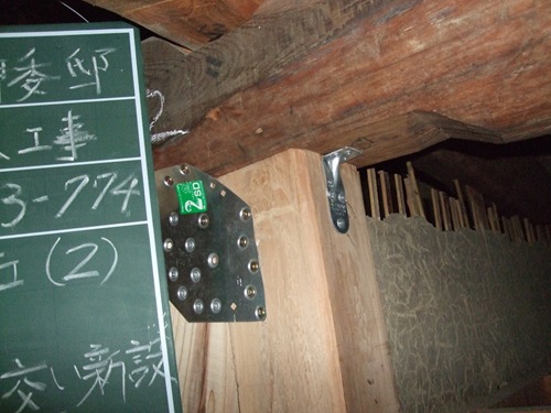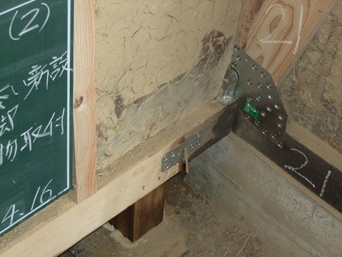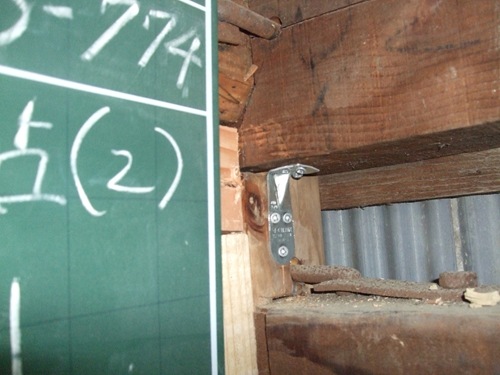 こちらの壁には構造用合板を張る計画です。まず天井の板を取りました。その後、既存の柱と梁にも金物を入れます。一つ一つは小さな金物ですが、これらをバランスよく設置する事が大事です。