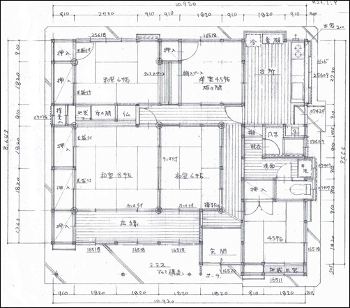 工事をする住宅はこのような間取りの築40年ほどのお住まいです。耐震補強工事は、家全体の強さを高めるために強さに偏りが無いように事前にしっかりとした計算をします。お客様が住みながらの工事となったため、部屋ごとに移動しながら工事を進めていきます。今回は南東の和室の補強工事をご紹介します。