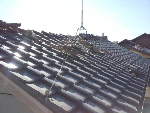 次は屋根瓦を外します。瓦は1枚1枚手ではがしていきます。