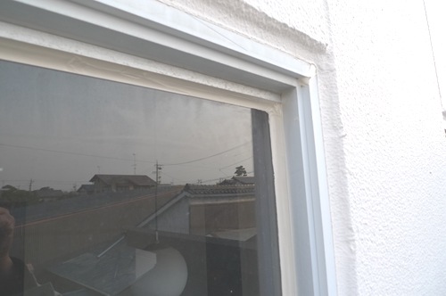 ガラスの周りから雨が染み込む事があった吹き抜け部分の窓ガラスです。ここは窓の周りにシリコンのコーキングをたっっぷりと施工しました。