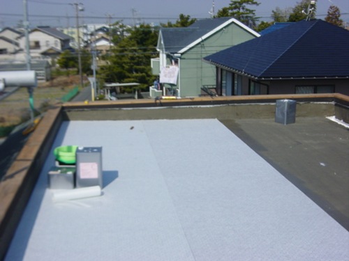 下地処理をした上にシートを敷いていきます。今回はウレタン防水と言う工法で防水層をつくりますので、防水の塗料を含ませるためにこのシートを貼るというわけですね