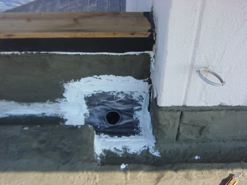 雨漏りの原因になりやすいドレン(排水パイプ)部分です。専用の部材を使って防水層をつくってあげます。もちろん、つなぎ目部分にも浸水しないように念入りに接着して処理します。