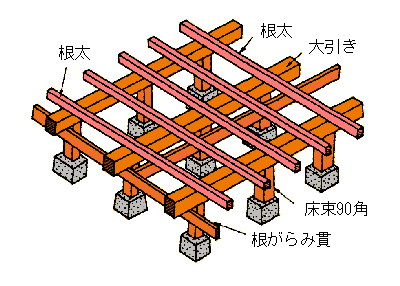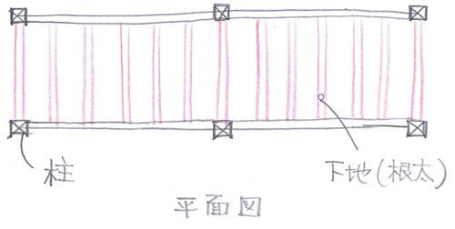こちらの家は木造の在来工法になります。在来工法の場合床を張るときに根太と呼ばれる下地の木が大体30cm間隔で入ります。そして、根太の上に1.2cmの合板フローリングを張っているんですね。