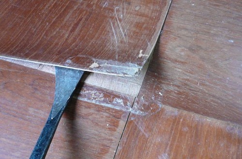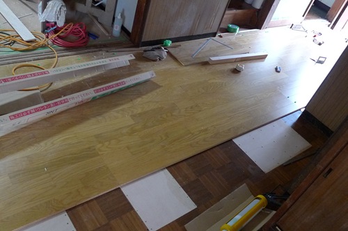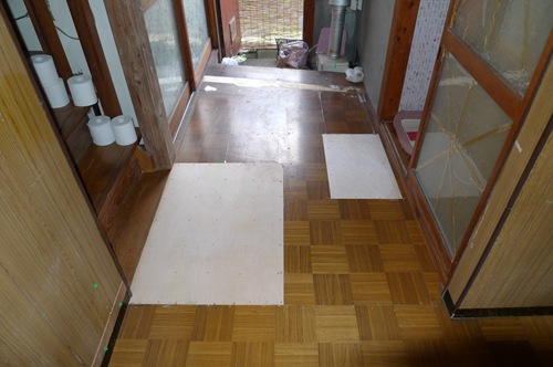 通常は、ブカブカした合板フローリングを撤去して新しい下地用合板を張り直し、その上に新しい床を張りますが・・・↓
