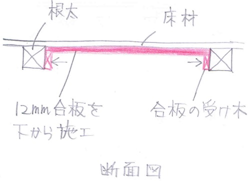 ブカブカする場所は、根太と根太の間の接着剤の効果が無くなっているところです。ですから、そこを支えてあげることができれば床のブカブカは解決します。