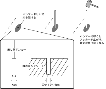 差し筋とは、強く打ちこむと先端が広がる特殊な形をした鉄筋を差し込む事です。これを使うと、別々の基礎やコンクリートをしっかり繋ぐ事ができます。