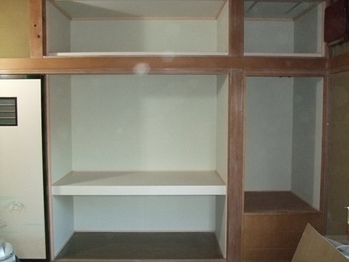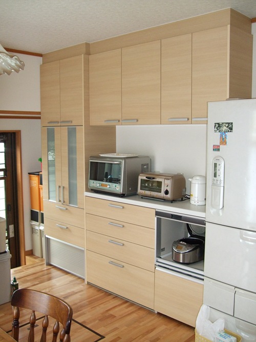 部屋の内側です。勝手口が壁になったことで、今までドアだった部分は壁に仕上げなければいけません。構造用合板の上は家具の色に近い化粧ベニヤを張り、周りにヒノキの造作見切りを付けて仕上げました。