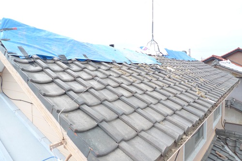 被害の大きかった瓦部分などは、すぐに応急処置をしないと少しの雨でも雨漏りしてしまうため、養生シート等で適切な処置をします。